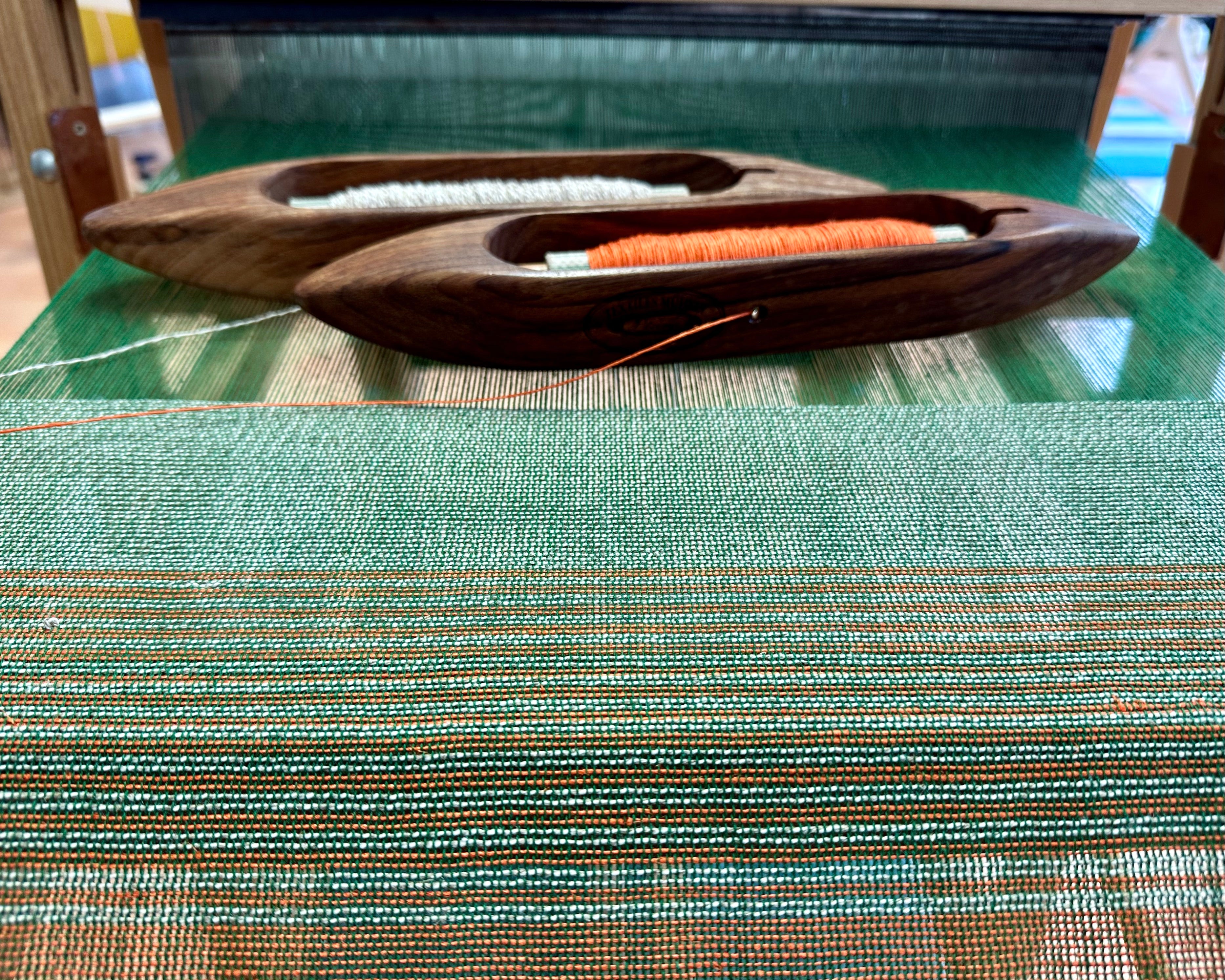 Az első óra végén csíkminták szövésével próbáljuk ki, milyen párhuzamosan, két vetélővel dolgozni. -